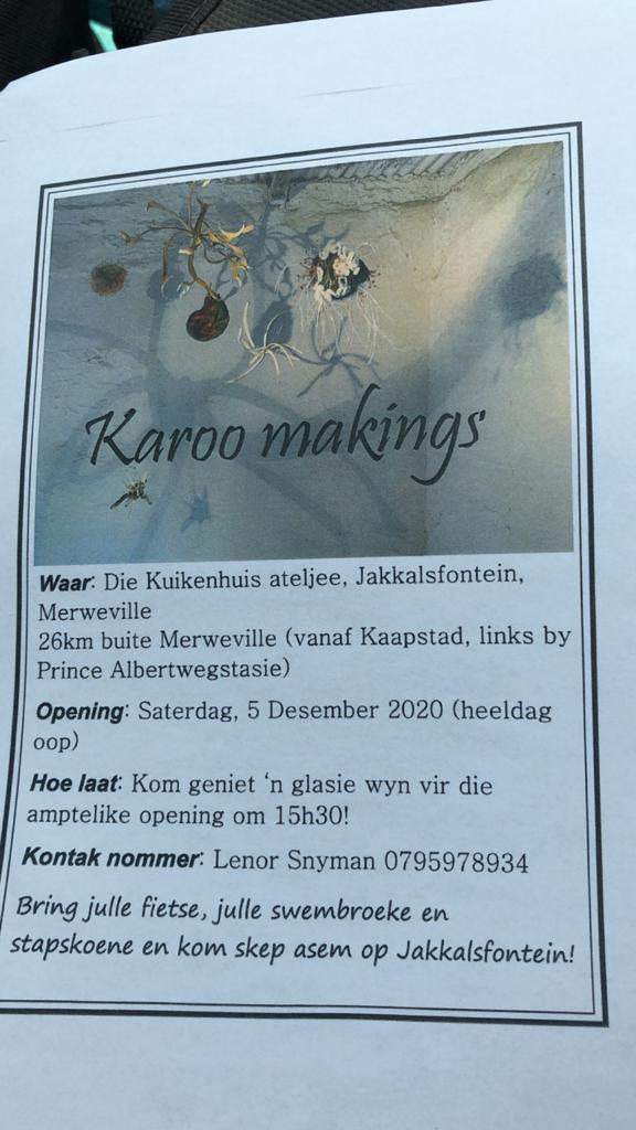 'n Unieke kunsateljee is Saterdag 5 Desember, net buite Merweville op 'n plaas gebore. Die Kuikenhuis-kunsateljee op die plaas Jakkalsfontein, is 'n direkte uitvloeisel van die afgelope maande se Covid-19-inperking wat die Snyman-gesin se kreatiwiteit laat blom het. So vertel Lenor Snyman, eggenote van die plaaseienaar, Kobus Snyman, wat voorheen hoof van die Hoërskool Zwartberg op Prins Albert was.