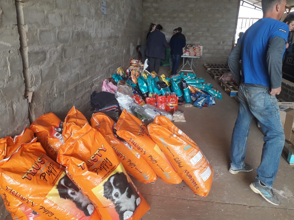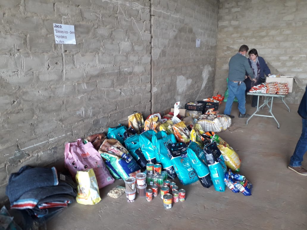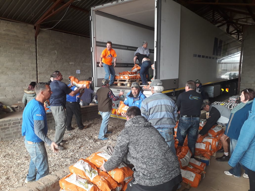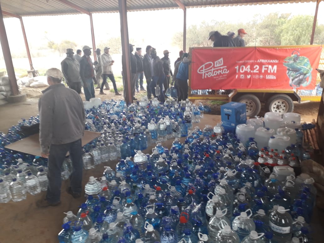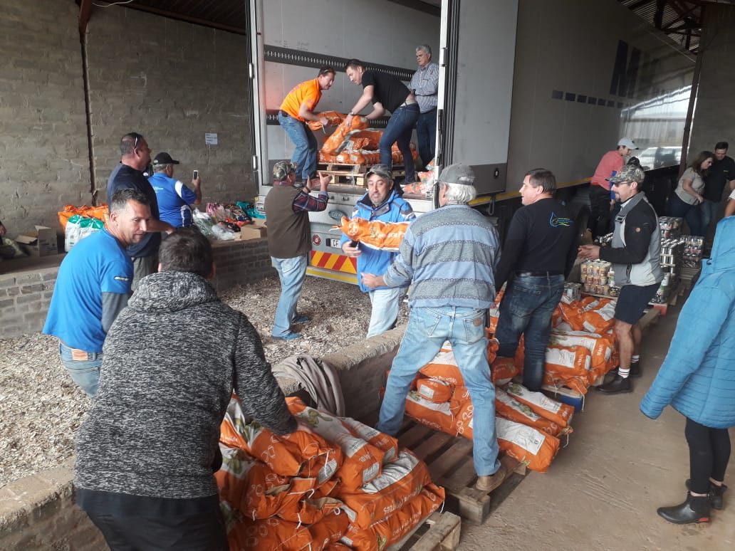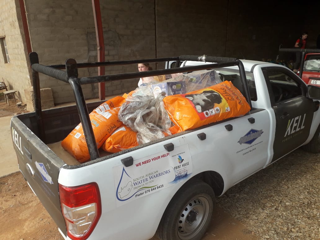 Die South African Water Warriors het vanoggend met twee konfooie, een van die Kaap en een vanaf George, kruineniersware, honde- en katkos, voer vir plaasdiere, bottels water en lekkergoed in Oudtshoorn aangekom. Die konfooi het eers deur die dorp gery en toe die kos op 'n plaas oo die Rooiheuwel-pad afgelaai en verdeel. Ten spyte van yskoue reënweer was die dag 'n reusesukses en het tientalle mense en kinders handjie bygesit om te help.