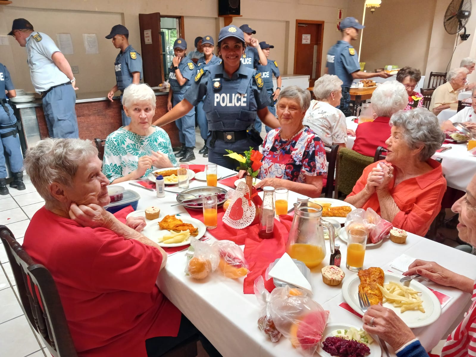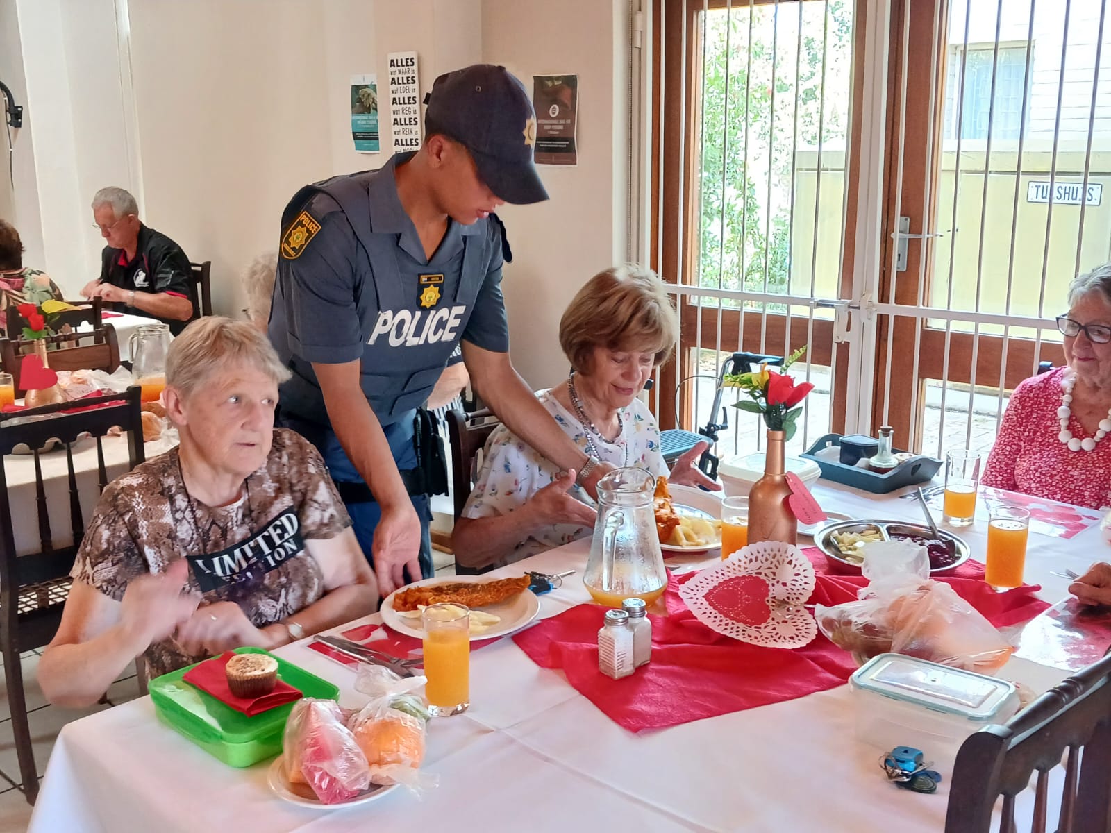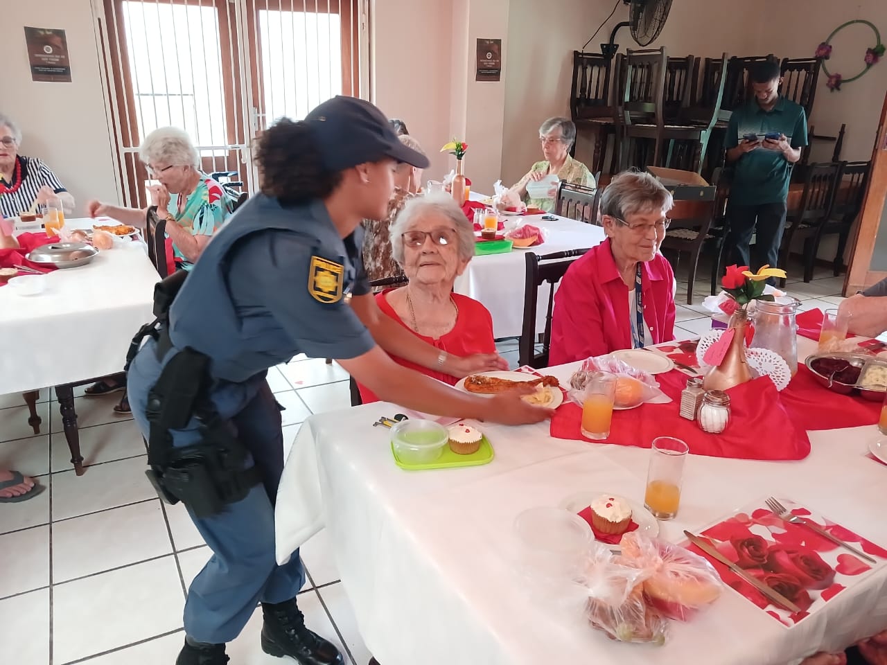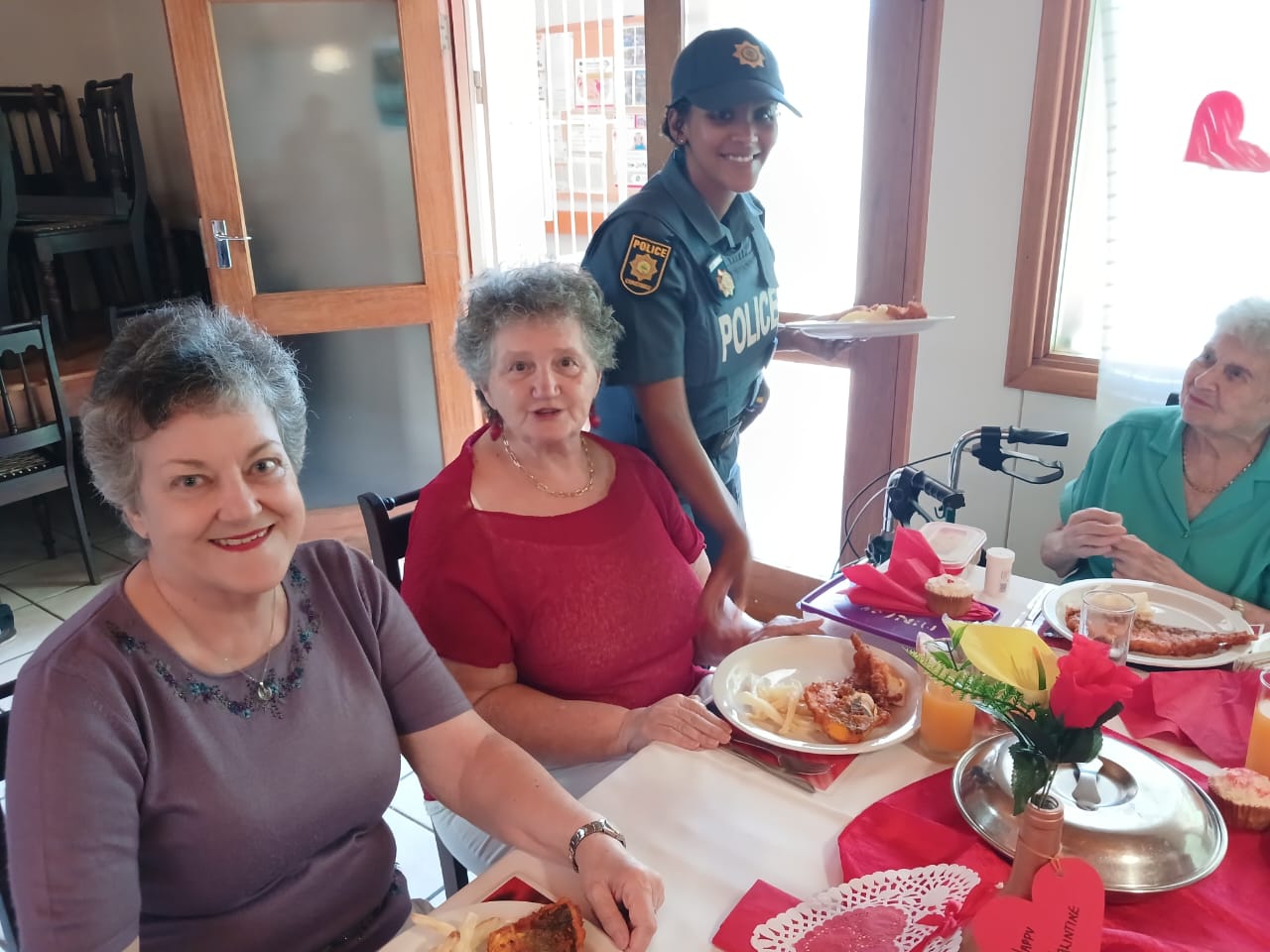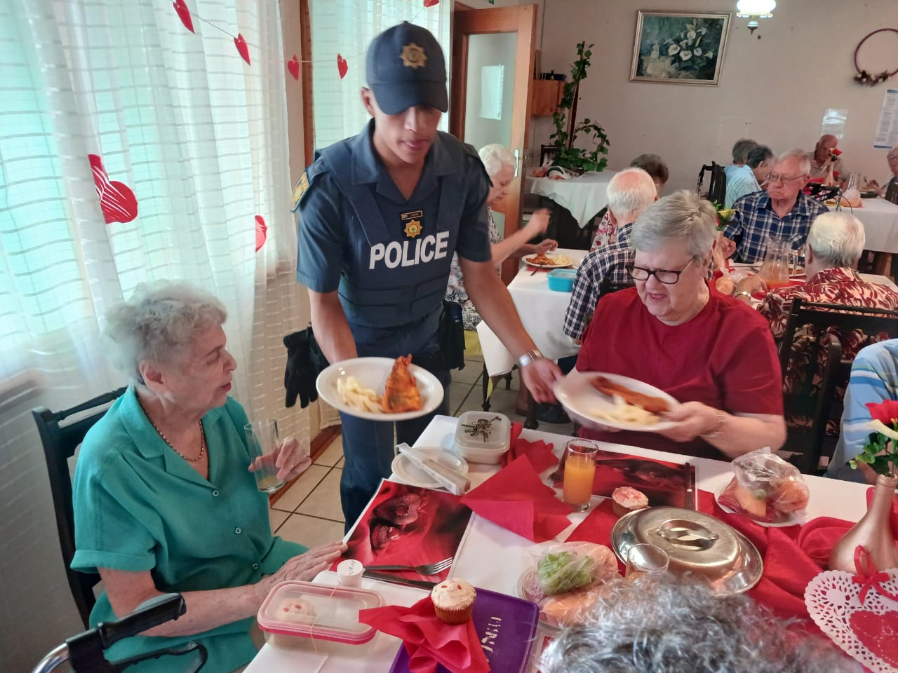 Lede van Oudtshoorn-polisie het tesame met Avbob kolwyntjies uitgedeel by Helen Bellinganhof-versorgingsoord op Vrydag 14 Februarie vir Valentynsdag. Die groep het as kelners opgetree en is middagte aan inwoners bedien.