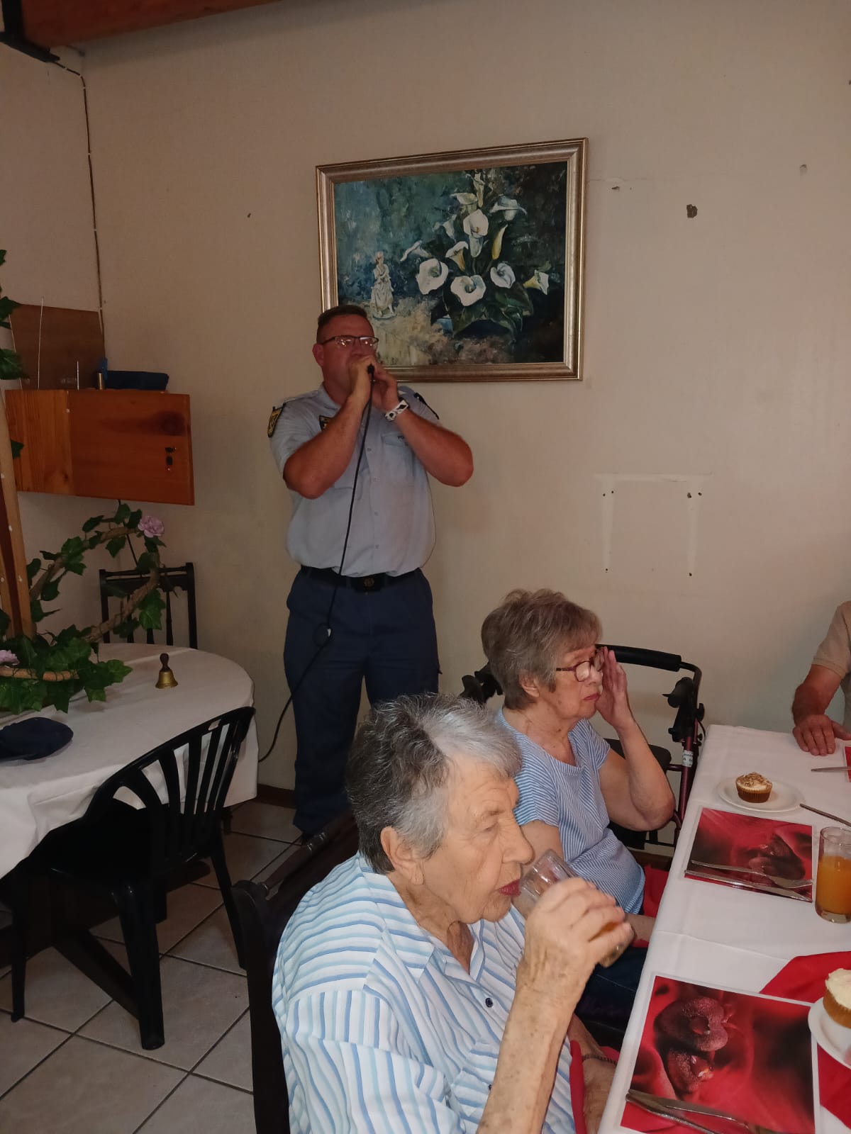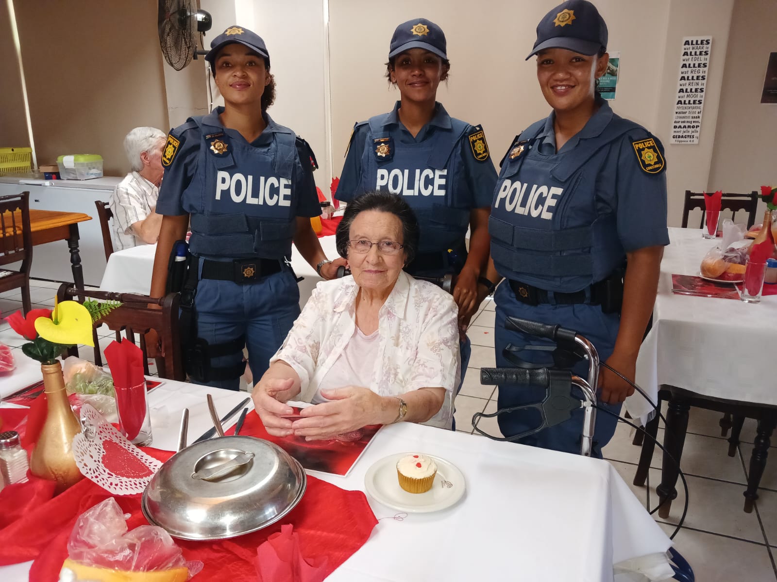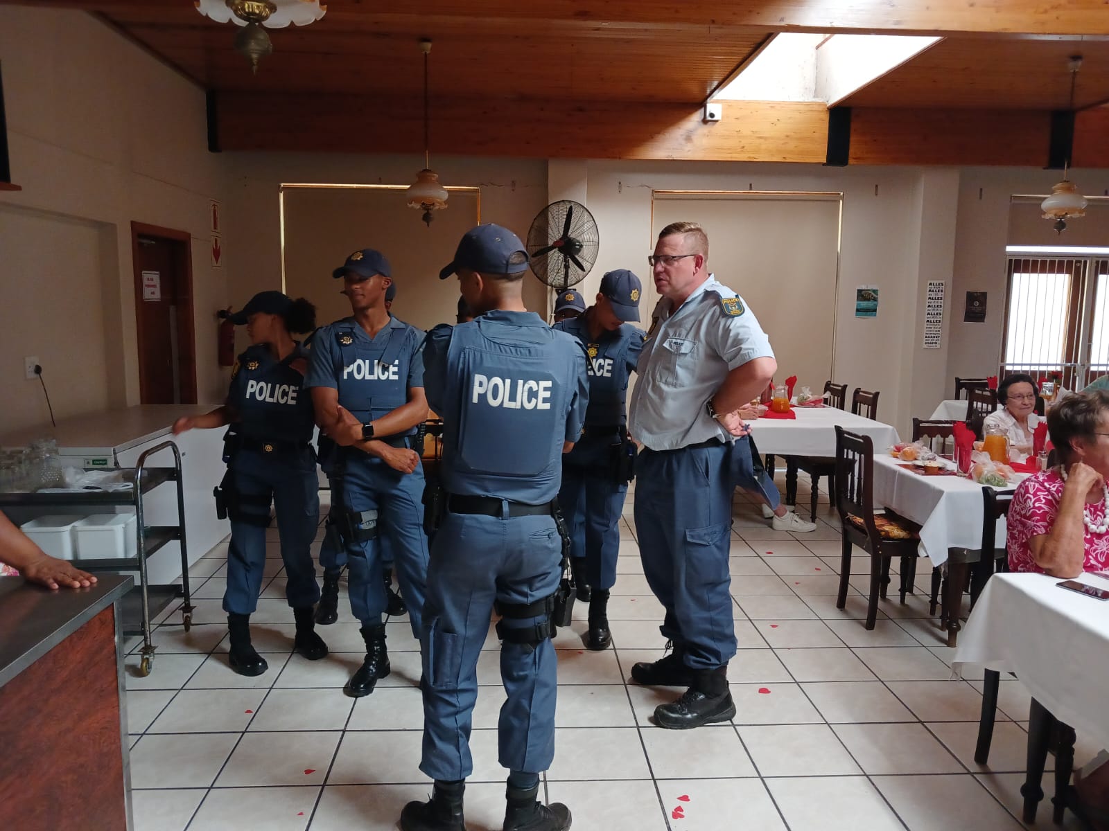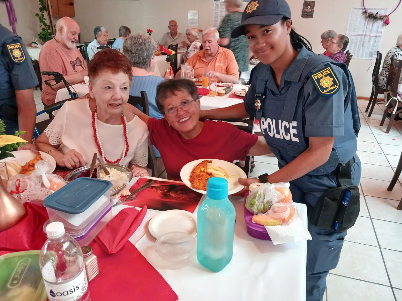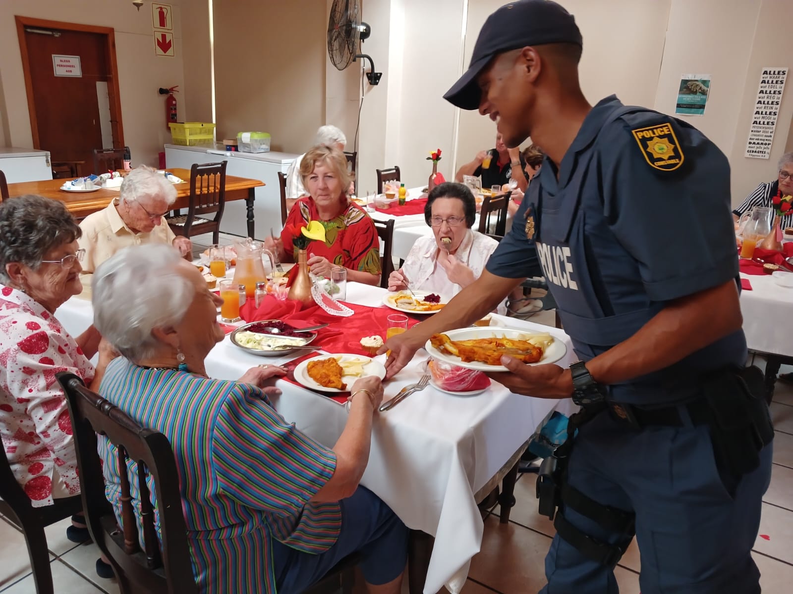 Lede van Oudtshoorn-polisie het tesame met Avbob kolwyntjies uitgedeel by Helen Bellinganhof-versorgingsoord op Vrydag 14 Februarie vir Valentynsdag. Die groep het as kelners opgetree en is middagte aan inwoners bedien.