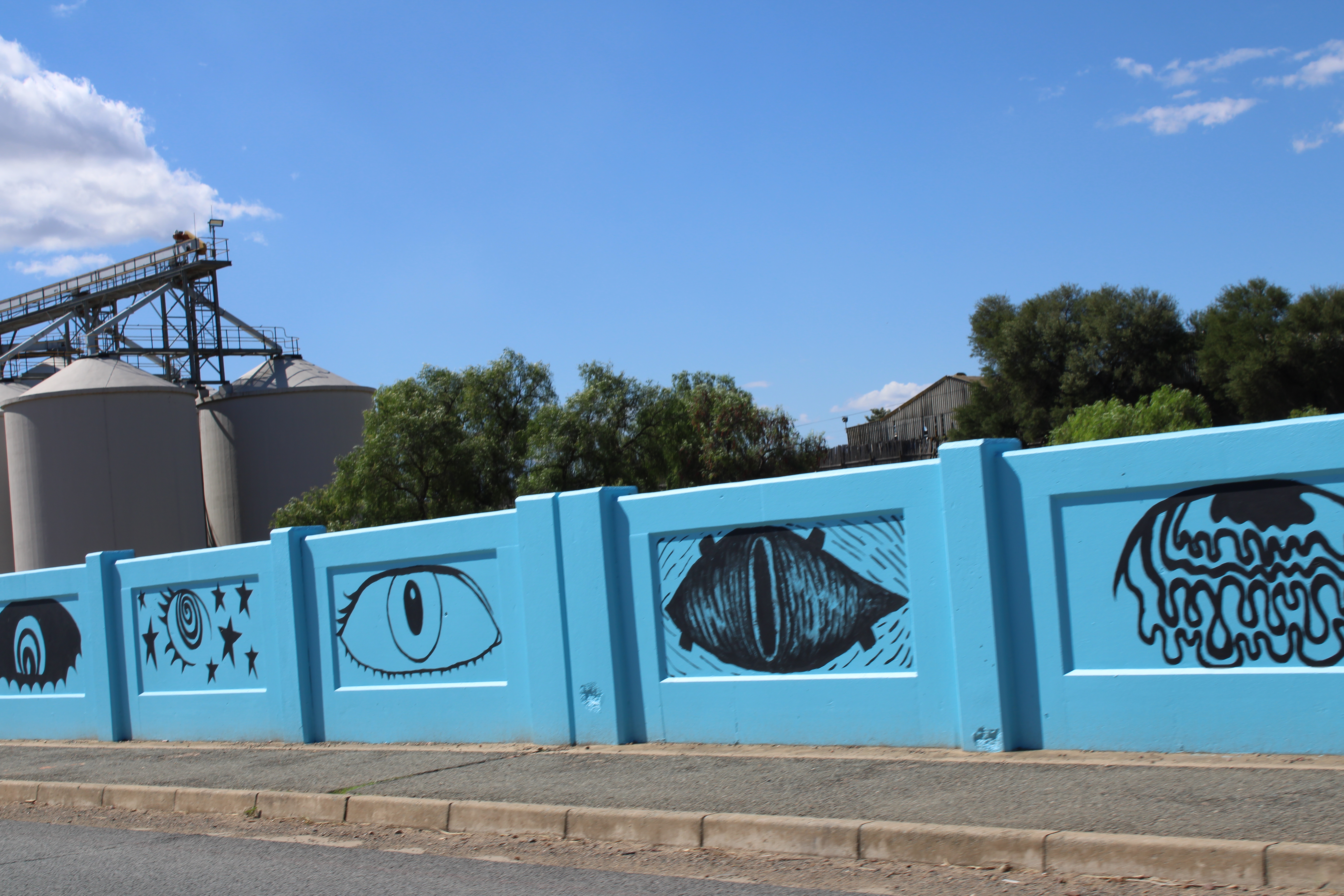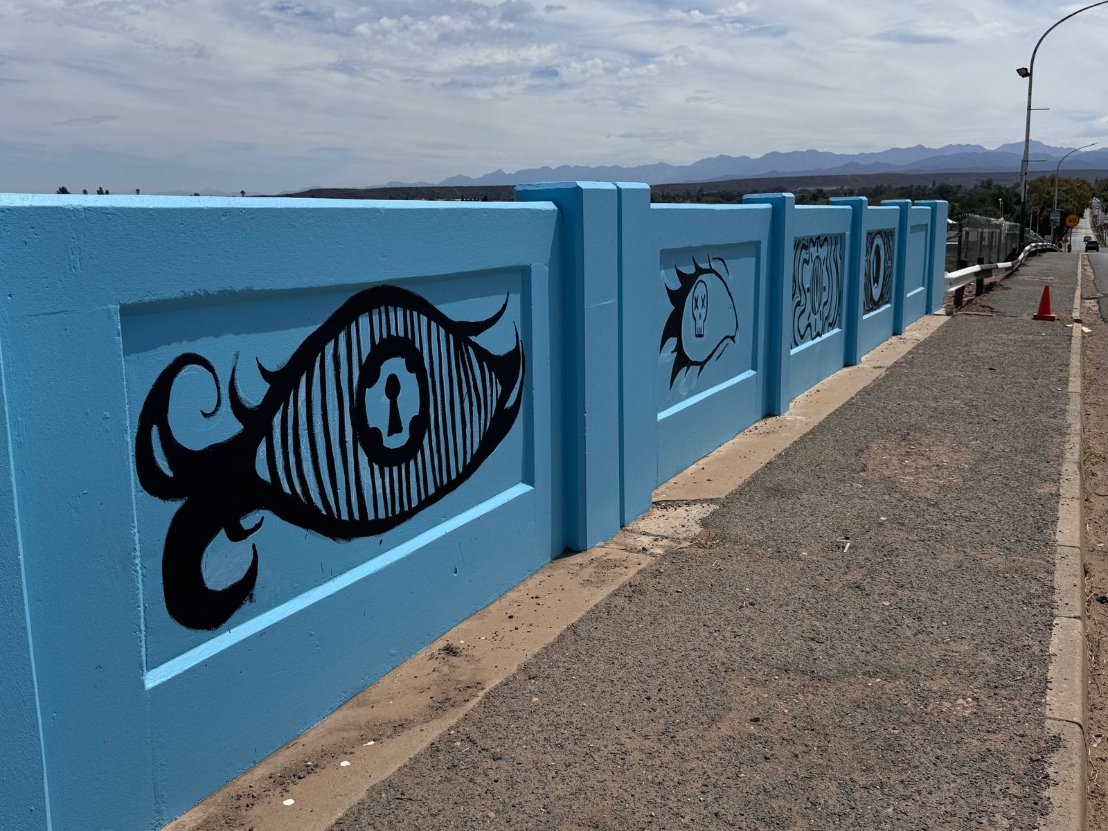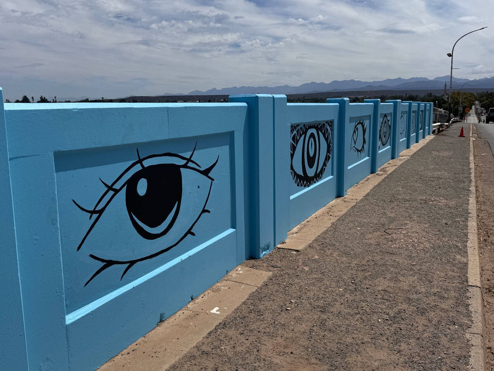 Die brug vanaf George na Oudtshoorn in Langenhovenweg is omskep in ’n kleurvolle baken.Hierdie permanente plekspesifieke werk strek oor 40 m aan beide kante van die pad. Die werk is geskep deur Norman O’Flynn, in samewerking met gr. 10 tot 12-kunsleerlinge van Hoërskool Oudtshoorn.Vir hierdie projek getiteld Future Vision het O’Flynn en die tieners van Hoërskool Oudtshoorn ’n aantal oë op die brug geverf om motoriste en voetgangers te herinner dat hul oë altyd oop moet wees – om bewus te bly van hul omgewing en die landskap waardeur hulle beweeg en waarin hulle leef. Die blou mure verwys na die blou lug in Oudtshoorn, asook die blou water van die Grobbelaarsrivier wat deur die dorp kronkel.Die projek maak ook deel uit van die Diepe Grond visuele kunste program van die KKNK. Fotos: verskaf