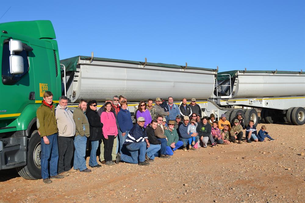 Boere en hul gesinne by die trok vol mielies voordat dit afgelaai is. Foto's: Tisha Steyn