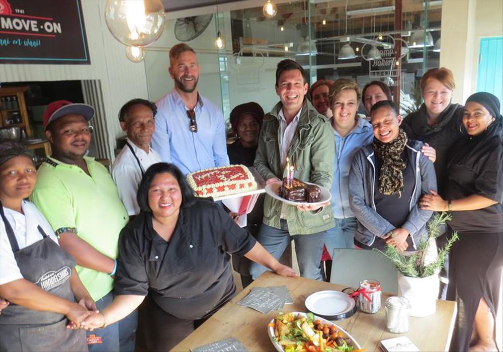 CAFE.DE.MOVE.ON is nie net 'n uitbreiding van die bestaande Wes-Handelshuis nie, dit is ook 'n stap om 'n plek met atmosfeer te skep waar klante kan kies om rustig te sit en koffie of tee en verversings te geniet of om haastig in te val, iets te koop en weer die pas te vat. "Daarom is die Cafe se leuse, Vat jou paai en waai. Jy kan net inhol, een van ons heerlike produkte koop en weer in die pad val as jy nie tyd het vir kuier nie," sê Jaco.