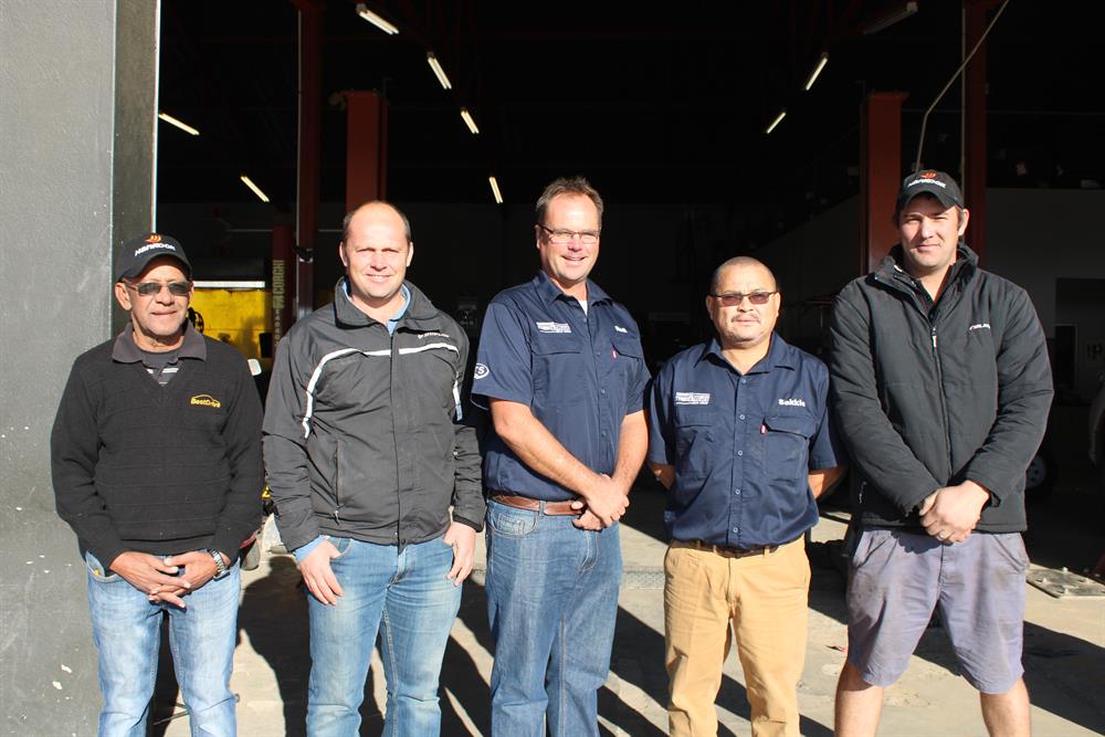 Die senior personeellede van Tyres & Treads op Oudtshoorn is van links: Vincent Campher, Theuns Botha (direkteur), Rudi Steyl (bestuurder), Isak Meyer (onderbestuurder ) en De Wet Britz (meganiese-bestuurder). Foto: Wyndham Ewerts