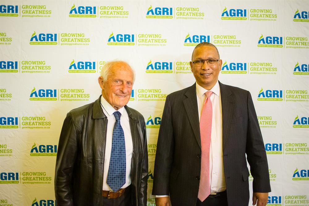Mnr Bob Reinecke saam met dr Ivan Meyer, Wes-Kaapse Minister van Landbou, tydens Agri Wes-Kaap se galadinee waar mnr Reinecke ‘n eretoekenning ontvang het.