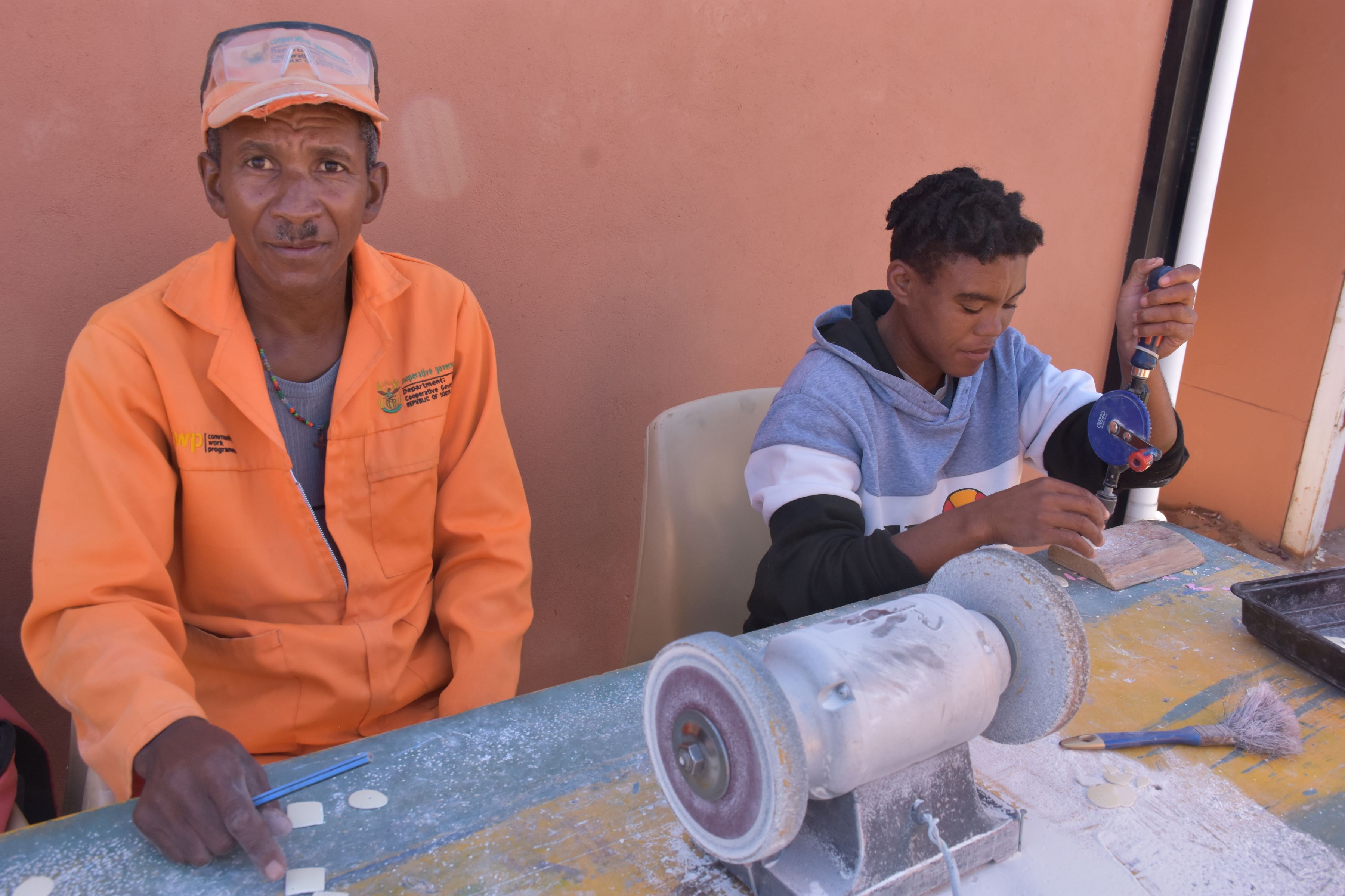 APD-kliënte verduidelik hoe hulle die volstruiseierdopoorbelle maak.