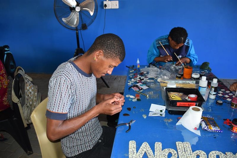 "Hier is tans, met die Dysselsdorp-tak, 44 volwassenes. Ons werk met persone met verskillende tipes gestremdhede. Baie van hulle is byvoorbeeld fisies gestremd weens beroertes of breinvliesontsteking as kind en kan dalk net een hand gebruik. Vir hulle om met soveel fyn detail te werk is absoluut ongelooflik. Hulle werk met groot trots om die oorbelle te maak."