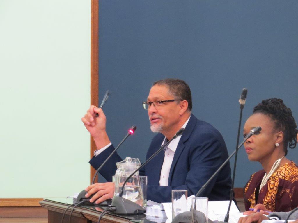 Die burgemeester, Colan Sylvester, wag om sy voorstel oor die begroting te maak.