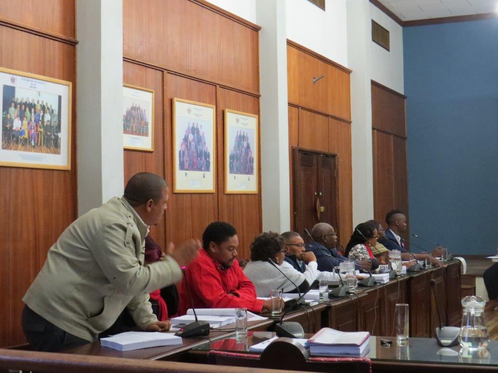 Raadslid Vlancio Donson (Icosa) in 'n woordewisseling met die speaker.