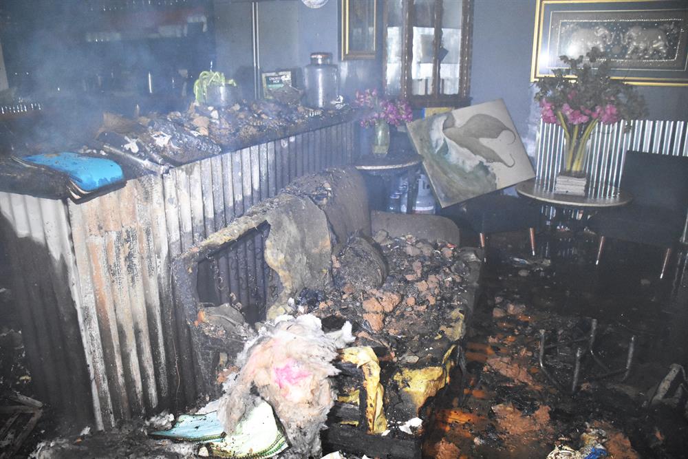 'n Deel van die kombuis en die leefarea wat in die brand beskadig is.