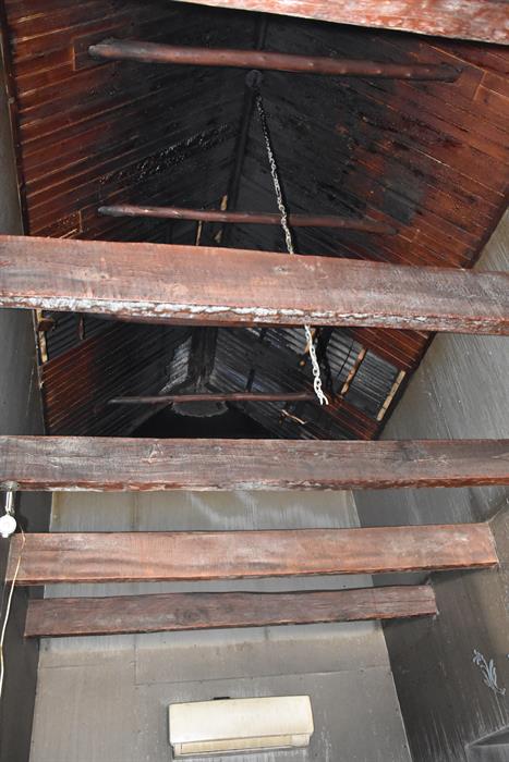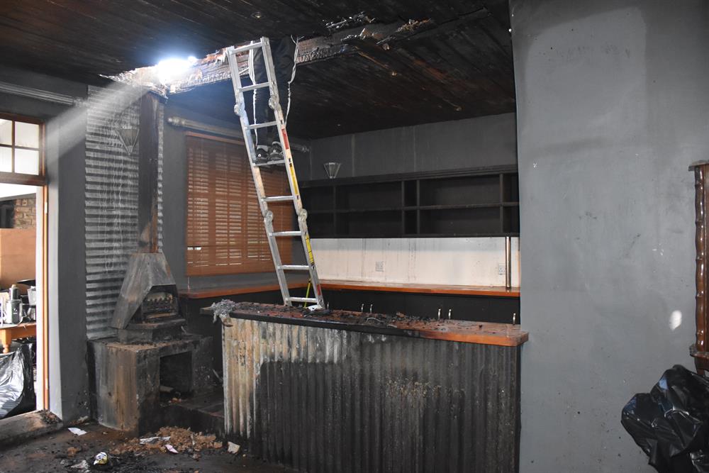 Die skade wat deur die brand aan die salon se dak aangerig is.