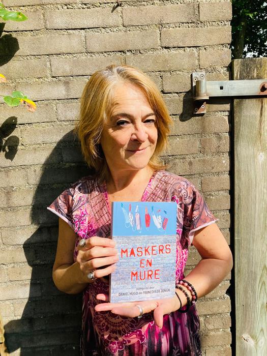 Verskeie kopieë van Maskers en mure is reeds in die buiteland. Hier is Irize Loots, 'n Afrikaanse digter in Nederland, met haar kopie. Haar eie bundel, 'Vlieg vorentoe', is vroeër vanjaar deur Turksvy publikasies uitgegee.