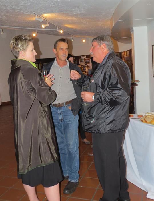 Alice le Roux, Willem Burger en André van Greunen verkeer gesellig saam.