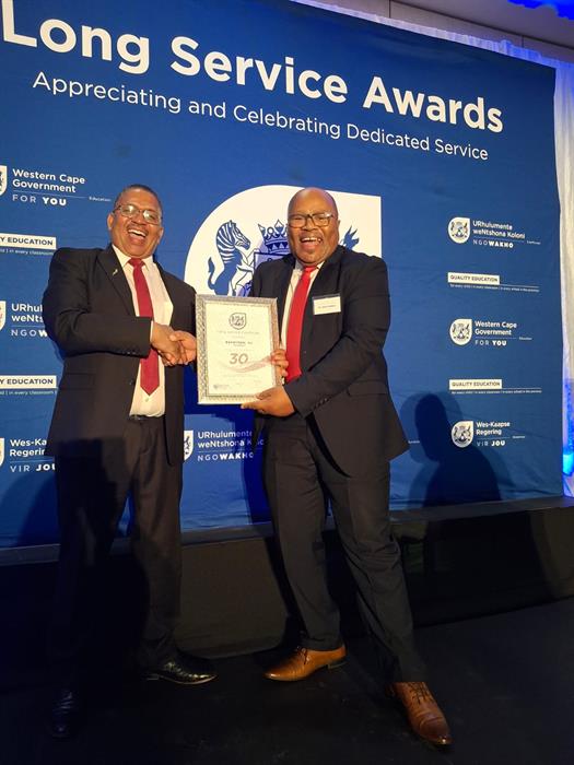 OUDTSHOORN NUUS - Hennie Baartman, skoolhoof van Eljada Kairos Skool, is onlangs vereer vir sy 30 jaar lange diens in die onderwys, waarvan hy 25 jaar as hoof gedien het.