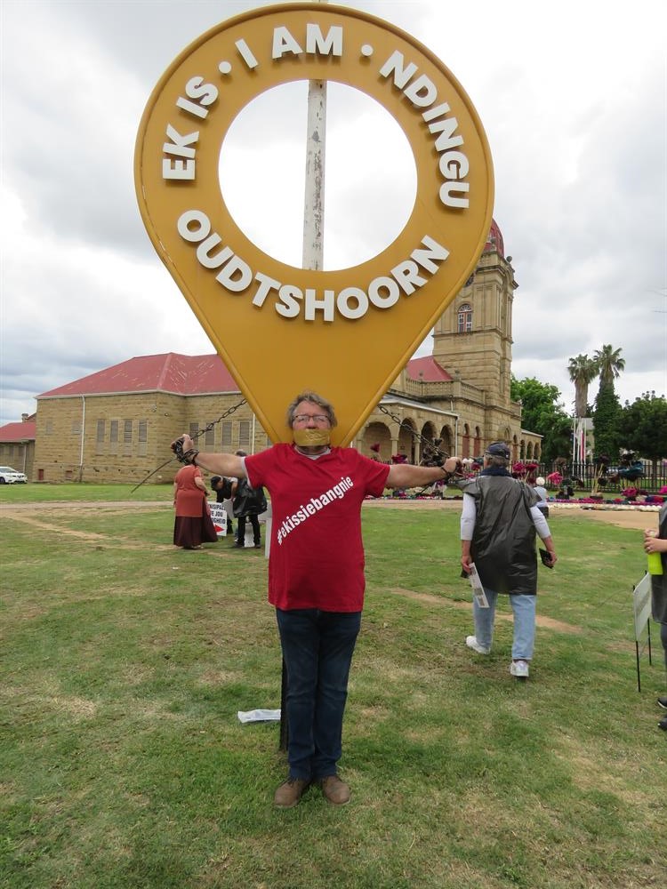 Arno Greyling van Oudtshoorn geketting aan die Ek is Oudtshoorn-bord oorkant die Oudtshoorn-munisipaliteit. Foto's: Stefan Goosen