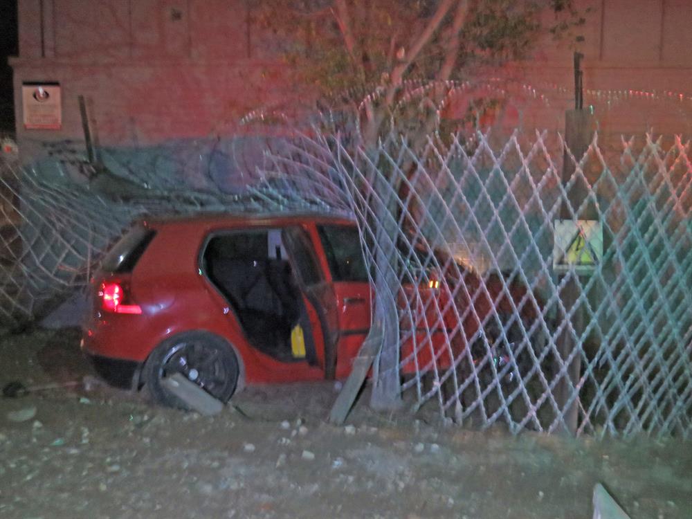OUDTSHOORN NUUS EN VIDEO - 'n Motor wat Sondagaand vir die polisie weggejaag het, het tot stilstand gekom nadat dit deur 'n heining gebars het. Volgens sers. Gretchen Michaels, woordvoerder van die Oudtshoorn-polisie het die rooi Golf vroeër die aand in Bridgton oor 'n stopstraat by die kruising van Poplar- en Swarthoutstraat in Bridgton gejaag.