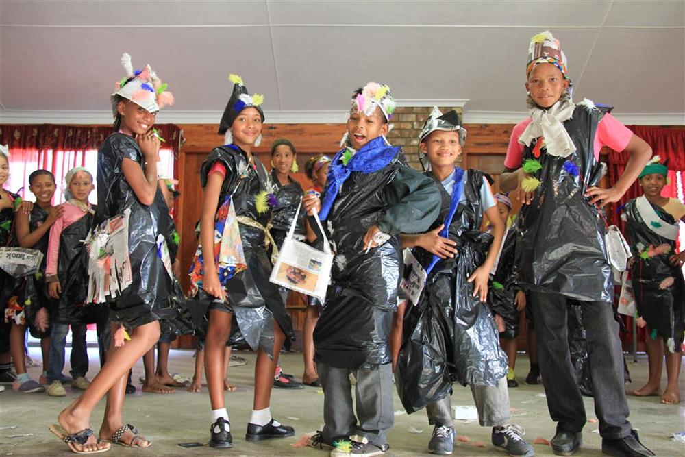 Kinders is gevra om met behulp van swartsakke, koerantpapier, vere en afvalmateriaal uitrustings vir 'n modeparade te skep. Hier is die wenners van die modeparade.
