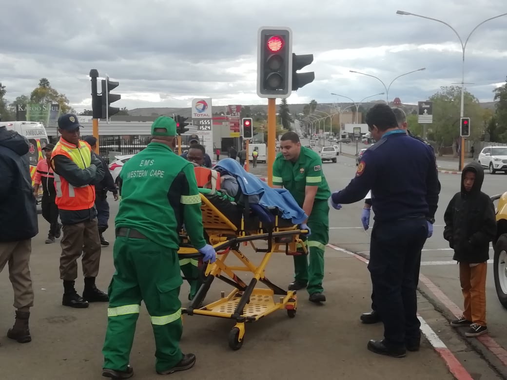 OUDTSHOORN NUUS - 'n Voetganger is vanmiddag beseer toe hy in Voortrekkerweg voor 'n karavaan beland het.