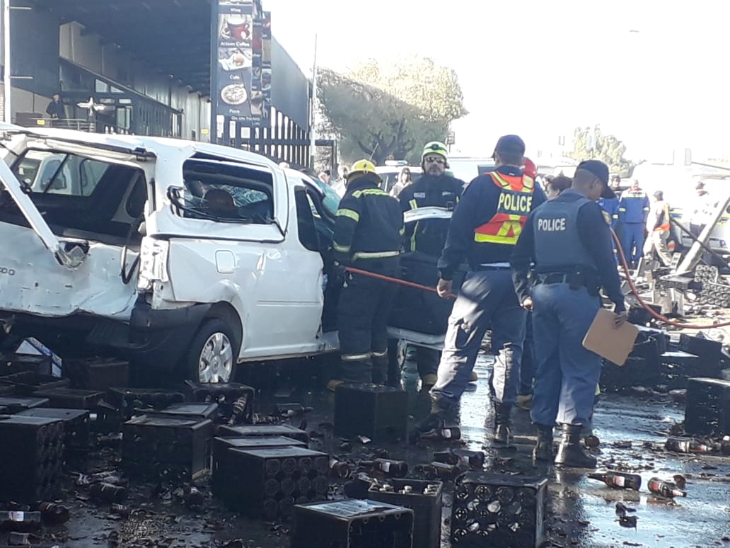 Nooddienste is besig om die bestuurder van die bakkie uit die voertuig te sny.