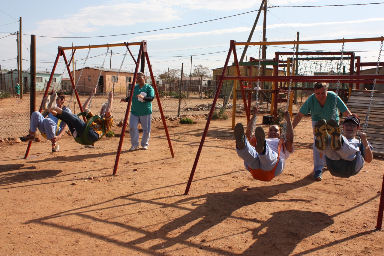 Die span het nie net die swaaie vervang nie, maar ook self ingespring met skuurpapier en 'n kwas om die klimrame en swaaie 'n nuwe laag verf te gee.