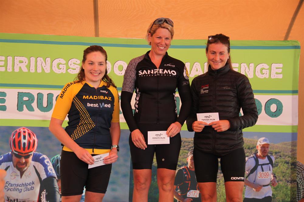 Chantelle Bosch (middel) was bobaas in die 61,5 km MTB vir vroue. Jackie Davidoff (regs) en Jean-Mari Roelofse was onderskeidelik in die tweede en derde plek.