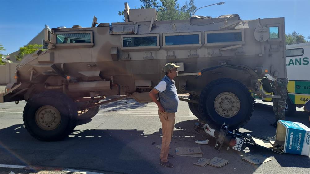 OUDTSHOORN NUUS - 'n Ongeluk tussen 'n Kasper-weermag- voertuig en 'n Checkers Sixty60-motorfiets-drywer, het verlede Woensdagoggend omstreeks 11:00 op die kruising van Baron van Reede- en Van der Baron van Reede plaasgevind.