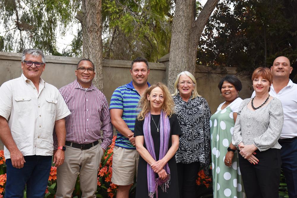 Van links is: Roelof Kwant, Willie Coetzee, Handri Calitz, Ingrid Noble, Christal Muller (bestuurder van Huis Triomf) en Nick Maritz. Voor: Eunice Strydom (streekbestuurder vir ACVV-beskermingsdienste in die Klein-Karoo) en Brende Brits. Foto: Liezl van Niekerk