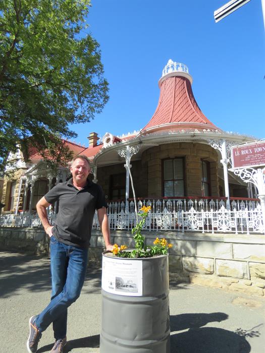 Johan Breunissen by een die dromme wat die geskiedenis van die Le Roux-dorpshuis uitbeeld. Foto: Hannes Visser