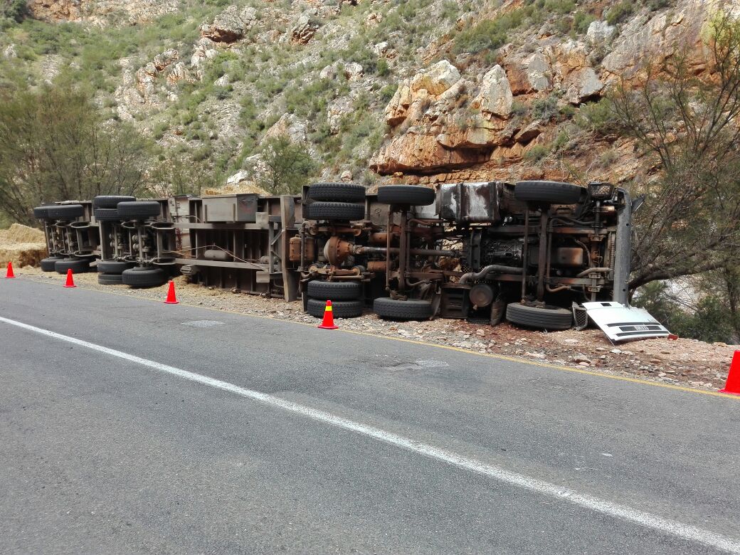 OUDTSHOORN NUUS - 'n Vragmotor wat met veevoer na George onderweg was, het vanmiddag in Meiringspoort omgeslaan.