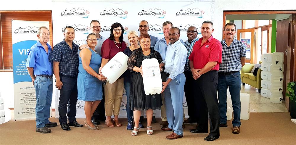 Raadslid Memory Booysen, uitvoerende burgemeeste van die die Garden Route distriksmunisipaliteit (GRDM) het die houers op 15 Maart aan Magdalena Barry, burgemeester van Kannaland oorhandig.