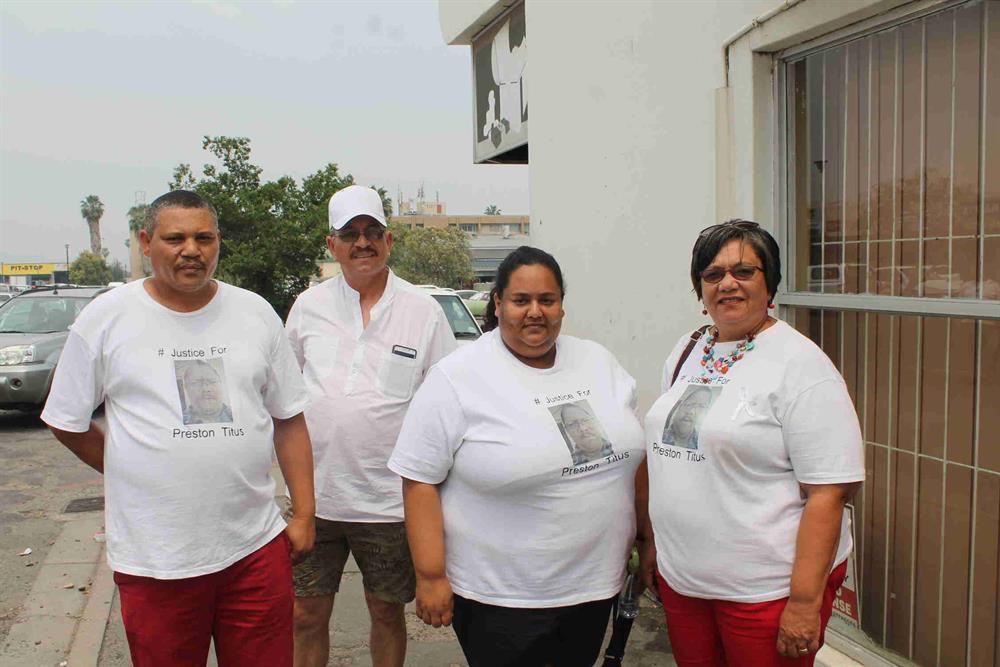 Familielede van wyle Preston Titus was Maandag vanuit Worcester by die hof op Oudtshoorn.Van links is: Angelo Wildschut (swaer), Theodore Titus (oudste broer), Gloria Solomons (susterskind) en Lusinda Wildschut (suster). Foto's Garnett Wicomb.