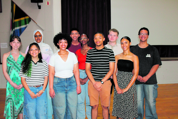 Die top-10-kandidate van Hoërskool Oudtshoorn. Voor, van links: Jordan Louw, Dayra Wessels, Ashley Jullies (duxleerder) en Zanicke McGear. Agter: Sue-Anne Janse van Rensburg, Nasirah Mohamud, Caleb Giewelaar, Likhona Gudla, Fabian de Kock en Oliver Marajh. Foto: Louise Mouton