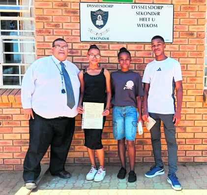 Marius Wagenaar, skoolhoof van Dysselsdorp Sekondêr, saam met Lesley Ann van Hansen, Renisha Windvogel en Kian Lewis. Foto verskaf