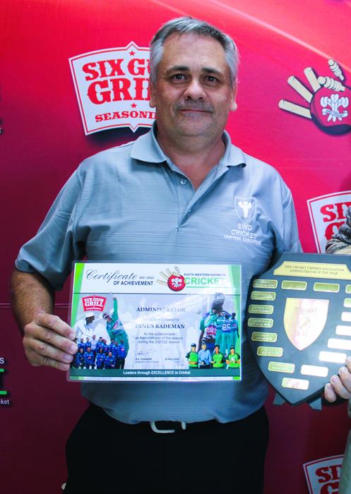 Innus Rademan, sekretaris van SWD-krieketskeidsregtersvereniging, ontvang die Administrateurtoekenning van die Jaar.