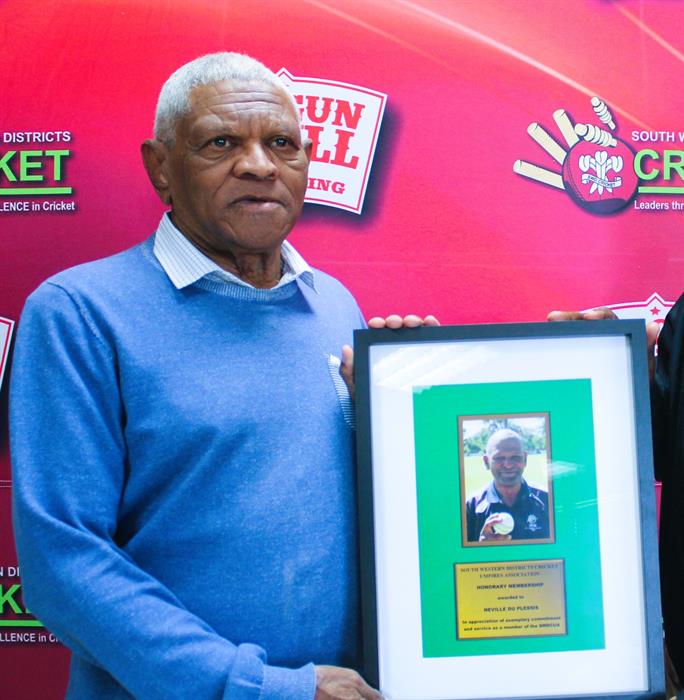 Lionel du Plessis ontvang namens Neville du Plessis erelidmaadskap van SWD-krieket. Foto's: Wyndham Ewerts
