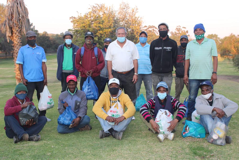 In die middel met die wit gholfhemp is die Oudtshoorn-gholfklub se klubkaptein, Paul Stroebel, saam met die joggies wat die kospakkies ontvang het.