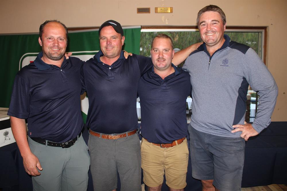 OUDTSHOORN NUUS - Rudi Steyl, Theuns Botha, Ben Vermeulen en Johan Botha van die plaaslike Tyre & Treads bande besigheid het verlede Donderdag die Klein Karoo Agri-groep se gholfdag by die Oudtshoorn-gholfbaan gewen.