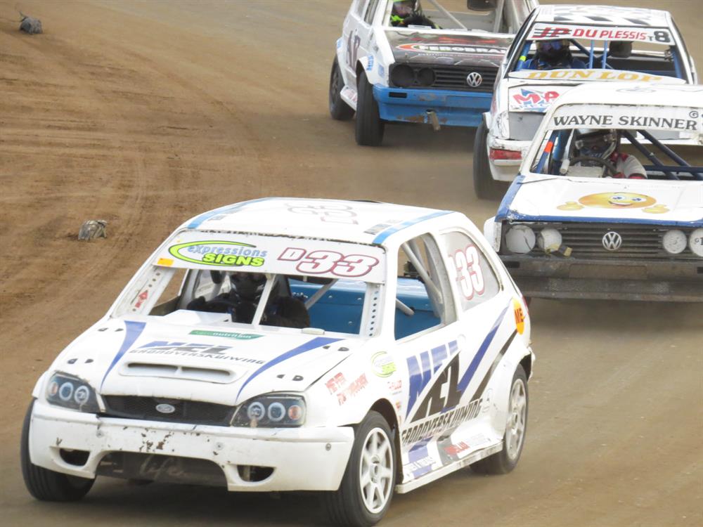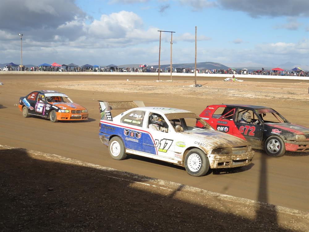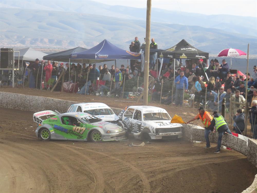 'n Botsing waarin twee Oudtshoorn-renjaers se motors ernstig bekadig is. Die Oudtshoorn-motors is die twee naaste aan die muur, Izaan Keller (regs) en Robbie Matthee agter. Foto's: Hannes Visser