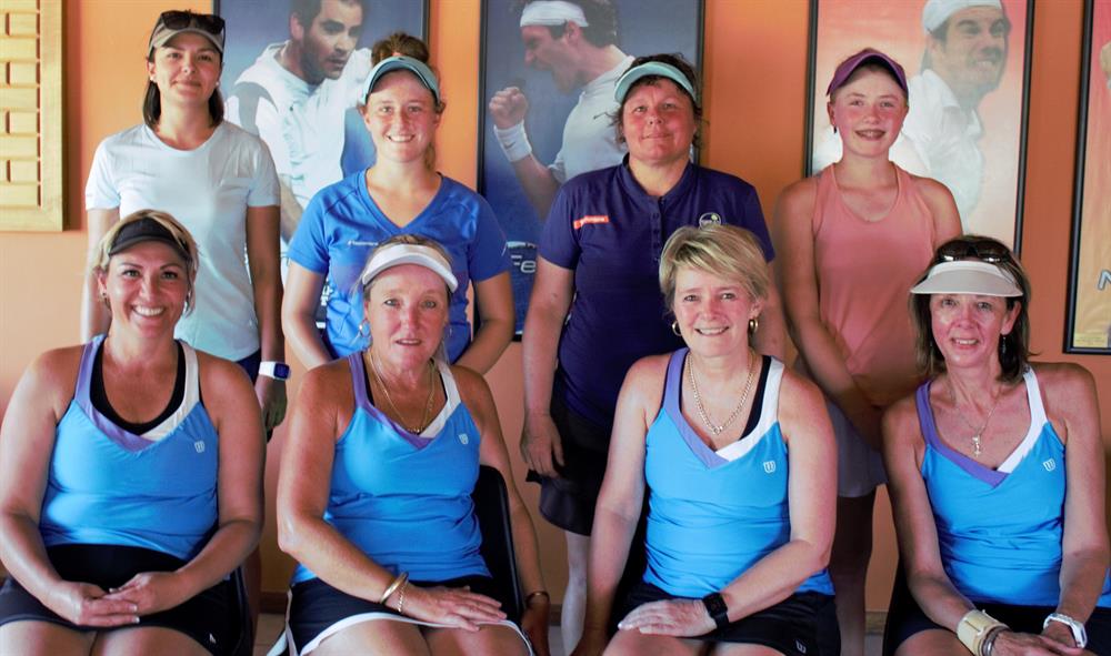 Die seëvierende vroue A-spanne van die Wesbank-tennisklub van Oudtshoorn is voor, van links: Retha Matthee, Christine van Coller (kapt.), Rida Bester en Karin Deltenre. Agter is Great van George se span: Angelica Stols, Ilé Lategan, Lizelle Fourie (kapt.) en Maaike Ferreira. Wesbank het dié wedstryd met 4-1 gewen. Foto: Garnett Wicomb